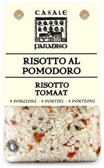 Ingrediënten: carnaroli rijst 92%, tomaat, peen, zwarte olijven,bieslook, basilicum, peterselie, uien.
