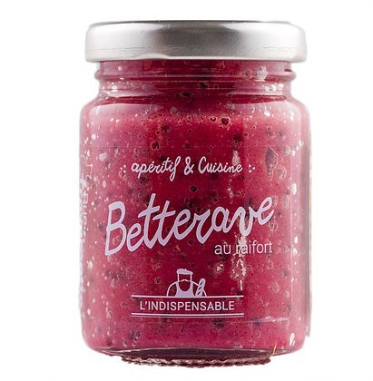 Betterave (48%), oignon, raifort (9%), Moutarde brune, vinaigre de cidre, huile d'olive, sel, miel, épices cornarom, poivre noir. Traces possibles de fruits à coque et d'arachide.
