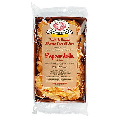 Deze ambachtelijke pappardelle van Rustichella d’Abruzzo is gedroogd in nestjes en heeft een mooie gele kleur door het hoge percentage ei van 31,7%. Pappardelle pasta is een Italiaanse pasta in de vorm van een breed lint. Qua breedte is de pasta gelegen tussen de tagliatelle en lasagne. De naam van deze pasta komt van het Italiaanse werkwoord “pappare”, wat betekent "opslokken".