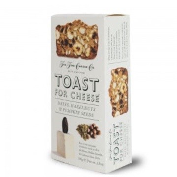 Fantastische luxe kaas biscuits. Toast gevuld met alleen natuurlijke ingrediënten als dadels, hazelnoot en pompoenpitten. De toasts zijn in dunne plakken gesneden en krokant gebakken.