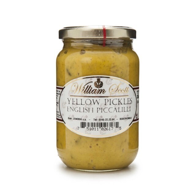 Een saus op basis van azijn, gevuld met zure uitjes, augurkjes en bloemkoolroosjes, en gekruid met mosterd en kurkuma.