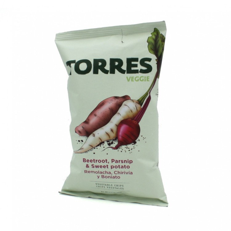 Het Spaanse chipsmerk Patatas Torres maakt heerlijke chips in verschillende smaken: Groentechips ‘Veggie’ (rode biet, pastinaak, zoete aardappel). Inhoud 90g.