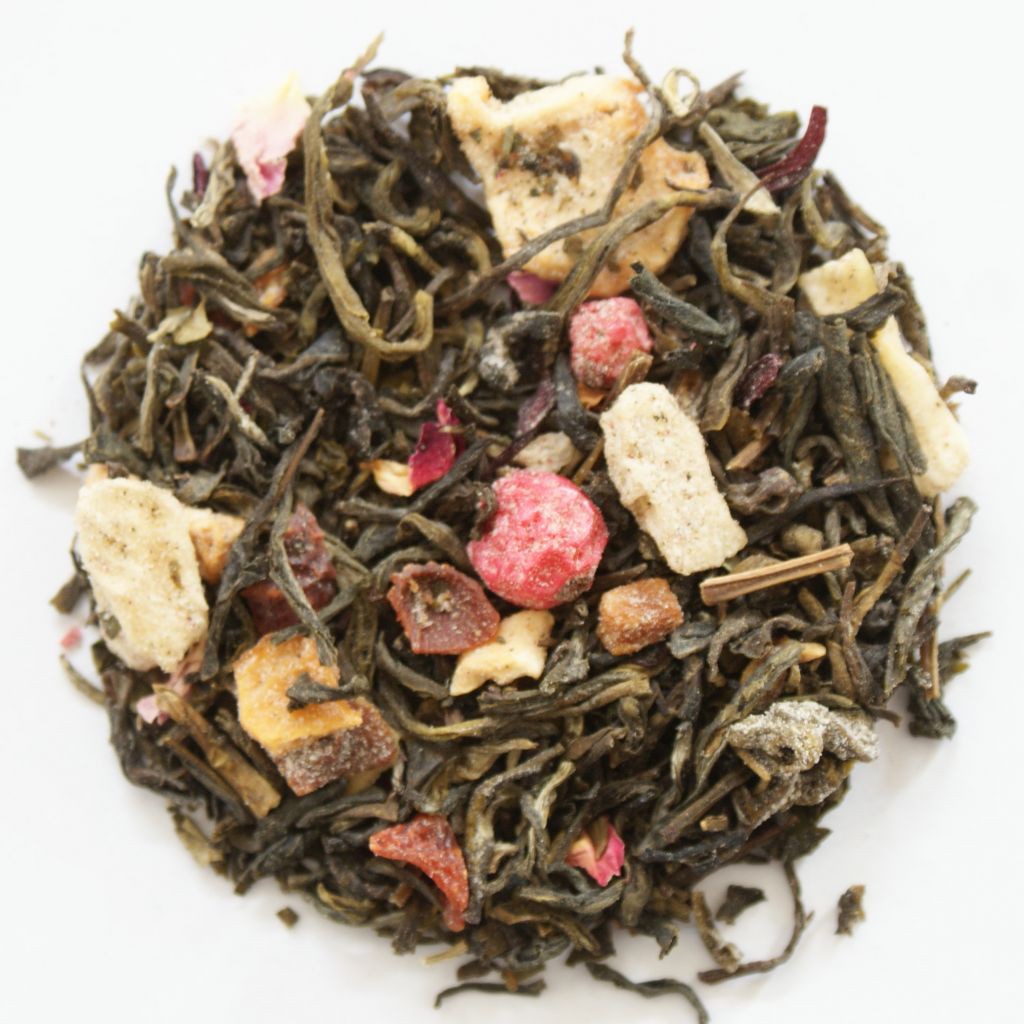 Ingrediënten: witte hee, appelhoekjes, rozenbottelschillen, stukjes ananas, stukjes mango, rode aalbessen, aroma, hibiscusbloesems, zoete braambessenblaadjes, rozenbloesemblaadjes, açai-fruitpoeder (açai, maltodextrine).