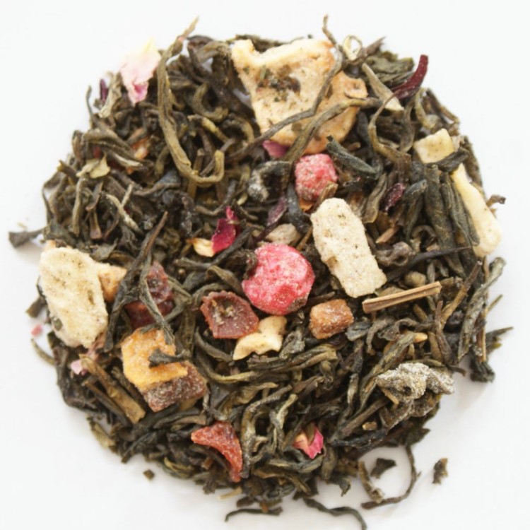 Gearomatiseerde mengeling van witte thee en vruchten. Exclusieve china mao feng met de trendy smaak van tropische açai-bessen, begeleid door een fruitige, exotische notie van ananas en mango.