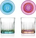 2 Stijlvolle glazen uit de Pedro & Rosa serie. De glazen stellen eigenlijk een man en een vrouw voor, beide afgebeeld met een mexicaans dooshoofd symbool op de bodem. 1 Glas is uitgvoerd in de kleur fuchsia/oranje en het ander in turquouse/groen. Mede door deze kleuren krijg je met name met cocktails een spectaculair effect.