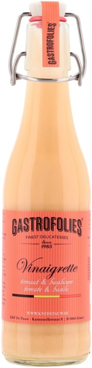 Ingrediënten: olie, azijn, eieren, kruiden, mosterd, basilicum, tomaat, suiker, glucose, rode bietextract.