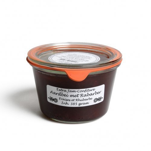 Ingrediënten: suiker, fruit (aardbeien 50%, rabarber 50%), voedingszuur: citroenzuur, geleermiddel: pectine. Bereid met 50 gram vruchten per 100 gram. Totaal suikergehalte 63 gram per 100 gram.