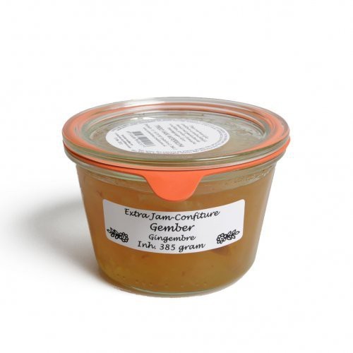 Ingrediënten: suiker, gember, voedingszuur: citroenzuur, geleermiddel: pectine. Bereid met 30 gram vruchten per 100 gram. Totaal suikergehalte 63 gram per 100 gram.