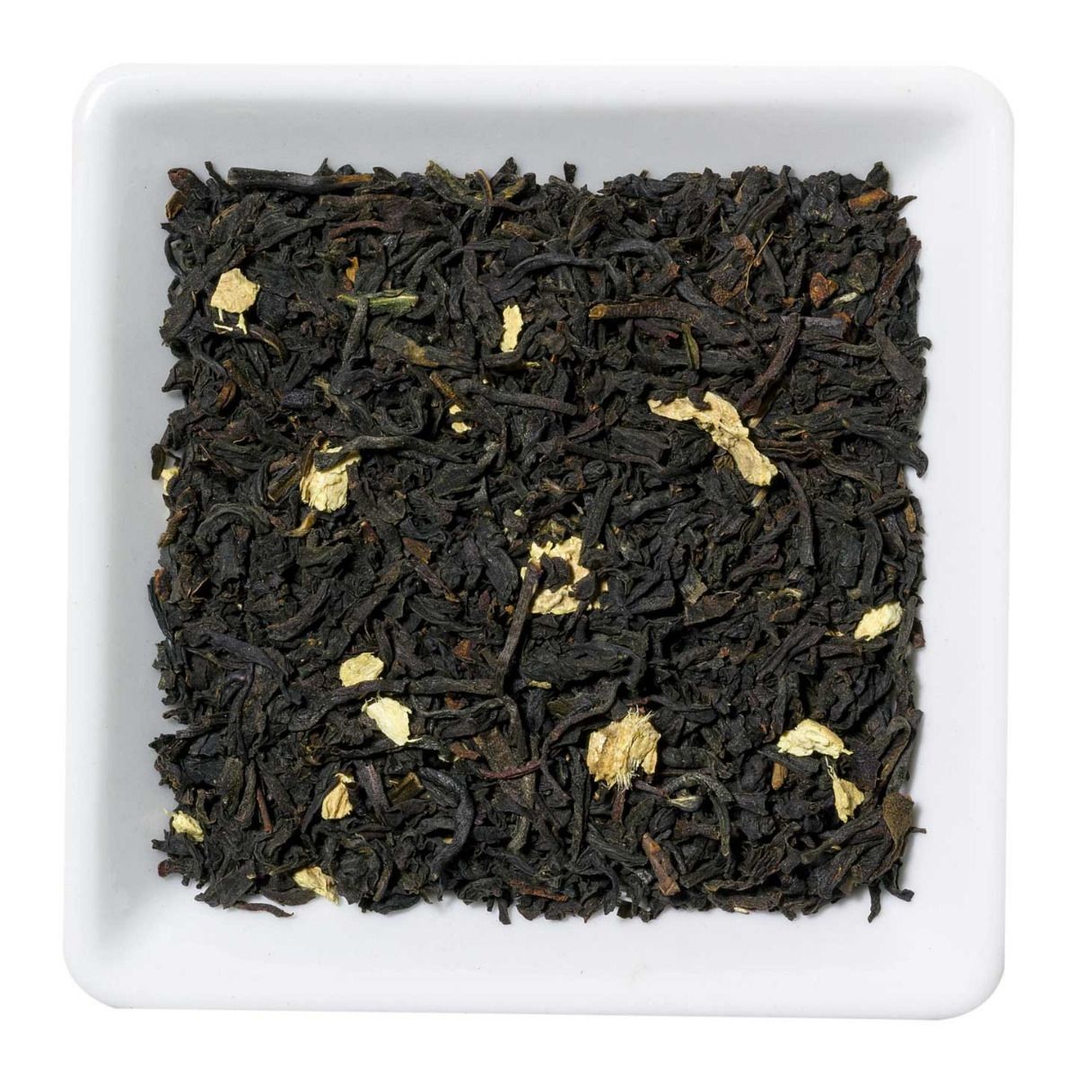 Een zwarte Chinese geparfumeerde thee met stukjes gember,